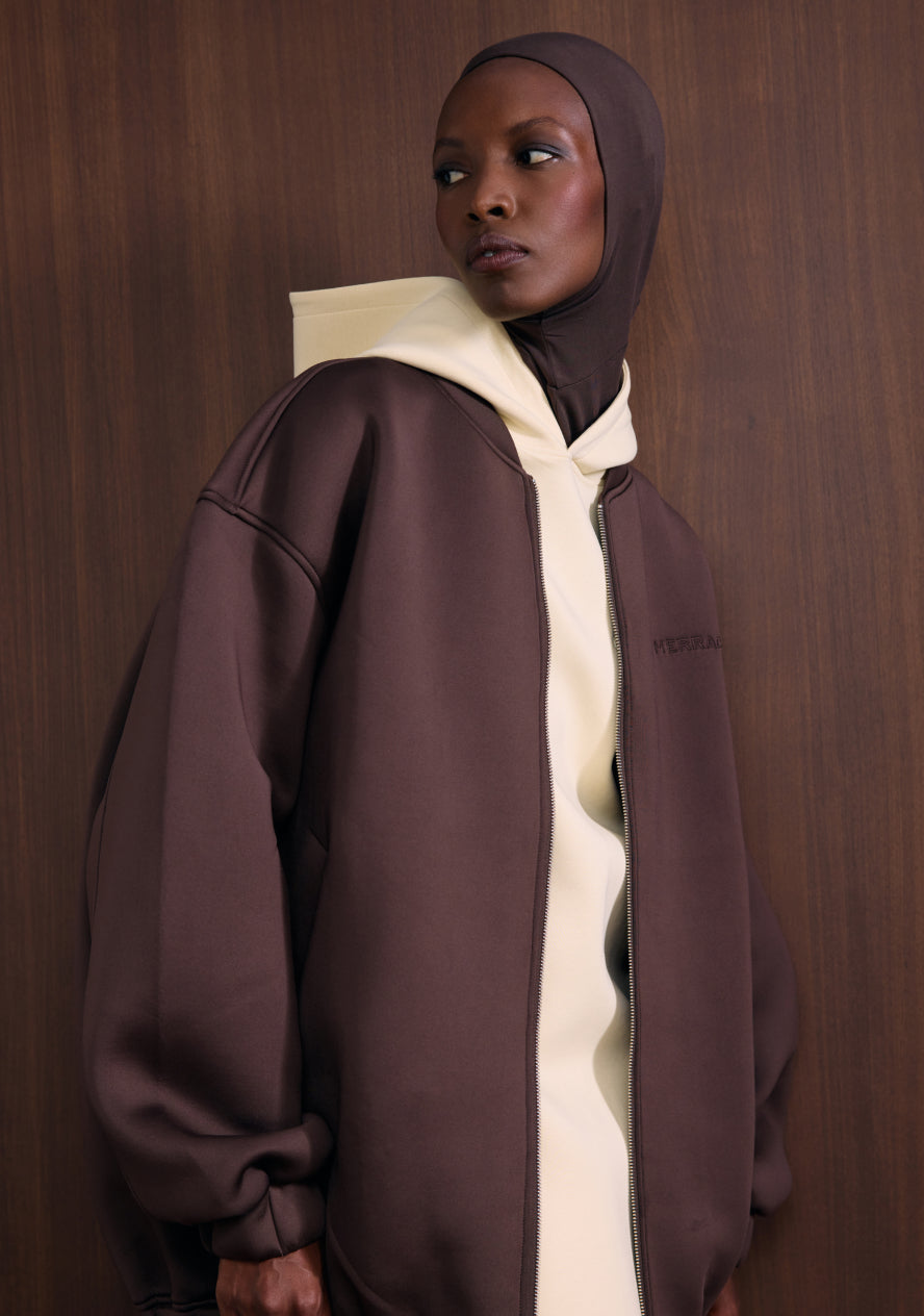| The Neoprene Bomber jacket combines a modern twist on a classic silhouette with a structured fit, featuring sleek neoprene fabric, a silver zipper, and an oversized design with dropped shoulders and voluminous sleeves, offering warmth, comfort, and a contemporary, minimalist look for casual or semi-formal layering. |